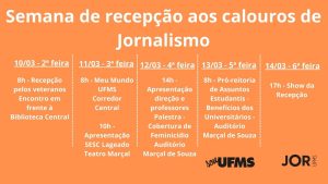 A Coordenação do curso de Jornalismo da Faculdade de Artes, Letras e Comunicação da Universidade Federal de Mato Grosso do Sul, em conjunto com todo o corpo docente e Centro Acadêmico do curso, preparou uma programação especial para receber os calouros.