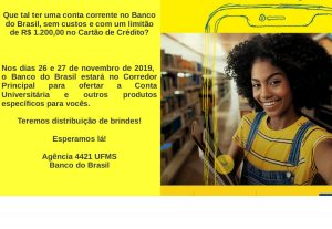 Nos dias 26 e 27 de novembro, o Banco do Brasil estará no corredor central ofertando a Conta Universitária e outros produtos para os acadêmicos.