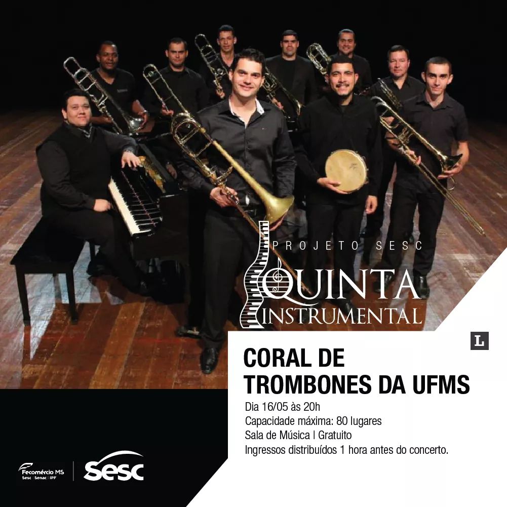 A Quinta Instrumental terá apresentação do Coral de Trombones da UFMS, projeto de extensão do curso de Música da UFMS, que leva ao público concerto com repertório eclético, iniciando com música clássica, passando pela música de cinema e finalizando com música brasileira. Os ingressos serão distribuídos uma hora antes da apresentação.