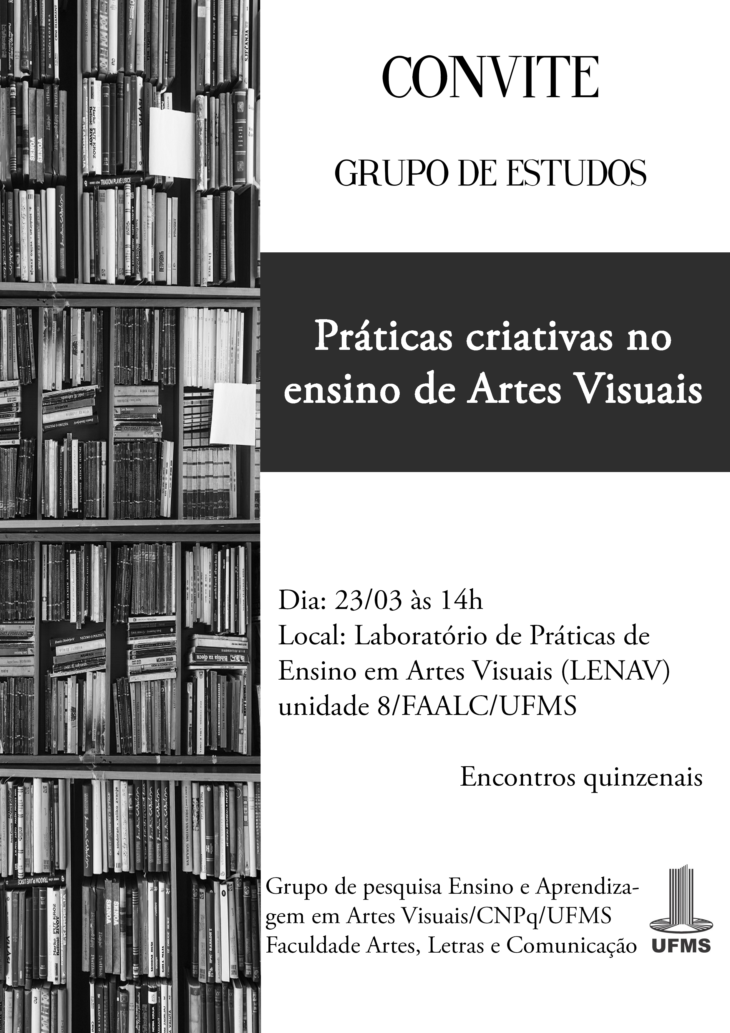 O grupo de estudos Práticas Criativas no Ensino de Artes Visuais é uma extensão do grupo de pesquisa Ensino e Aprendizagem em Artes Visuais/CNPq/UFMS, e tem como foco principal promover reflexões e aprofundamento conceitual sobre os processos de ensino e aprendizagem em artes visuais, no que se refere à práticas criativas, processos inclusivos e organização do trabalho pedagógico, numa abordagem histórico-cultural.
